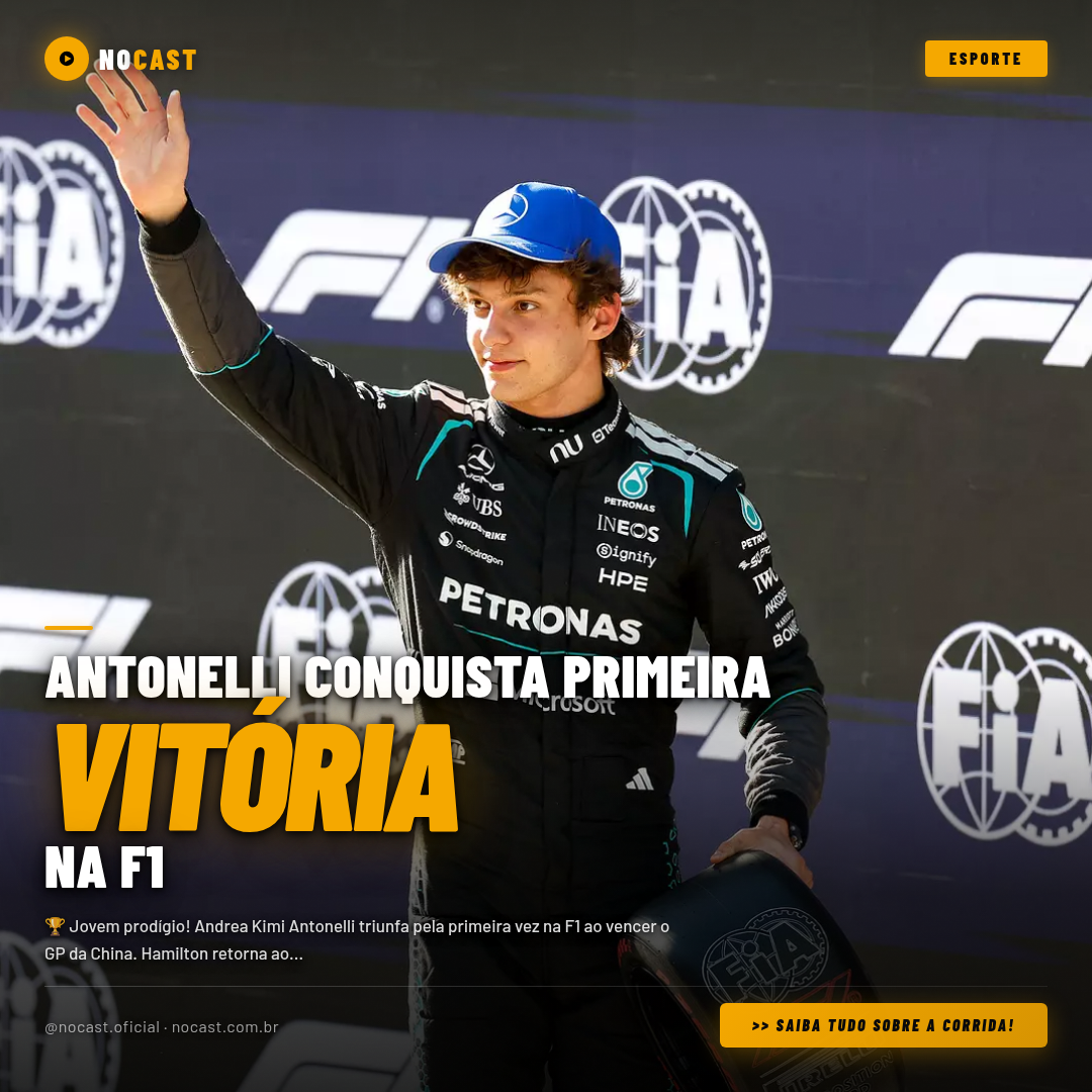 LIDE: O jovem italiano Andrea Kimi Antonelli conquistou sua primeira vitória na Fórmula 1 neste domingo, ao vencer o GP da China, no circuito de Xangai. Com apenas 19 anos, o piloto da Mercedes liderou grande parte da corrida, superando seu colega de equipe George Russell.Subtitulo do contextoA segunda etapa da temporada 2026 da Fórmula 1 trouxe emoções intensas em Xangai. Andrea Kimi Antonelli, um dos talentos mais promissores da categoria, mostrou habilidade e controle ao longo da prova. Russell, que completou a dobradinha da Mercedes, também teve uma performance sólida. Lewis Hamilton, outro piloto da equipe, voltou ao pódio, marcando um retorno significativo.Subtitulo do impactoA vitória de Antonelli simboliza uma nova era para a F1, destacando a renovação de talentos na categoria. A Mercedes, com um desempenho consistente, reforça sua dominância. Hamilton, com seu retorno ao pódio, demonstra persistência e habilidade, mesmo enfrentando desafios. Já Bortoleto, que não conseguiu largar, enfrentou problemas técnicos que o afastaram da corrida.”A vitória de Antonelli é um marco na história recente da F1″ — Analista de Esportes.O que acontece agoraApós a etapa na China, as equipes já se preparam para o próximo GP, buscando ajustar suas estratégias e corrigir falhas. A expectativa cresce em torno de Antonelli e seu potencial para mais vitórias. Enquanto isso, Bortoleto e sua equipe trabalham para resolver os problemas enfrentados. Hamilton busca consolidar seu retorno com mais pódios nas próximas corridas.Materia atualizada em 2026-04-20. Acompanhe mais noticias no Nocast.